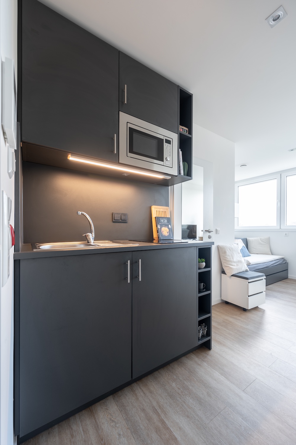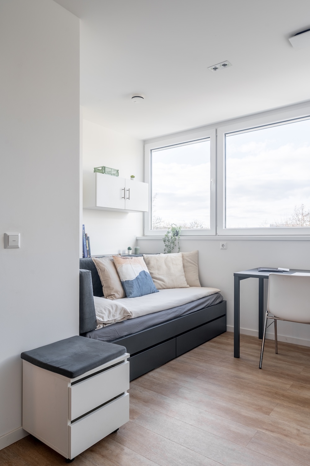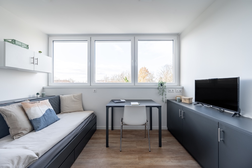 The Studio gives you everything you need over 20 m² of easy, modern living. Fully furnished with a 140 cm bed, your own mini kitchen with a stove, microwave oven and fridge, and a private bathroom, it’s built for comfort and independence. Whether its set quieter riverside or the dynamic view of the railway, it’s the kind of space made for slow mornings, focused afternoons, and recharging in peace.