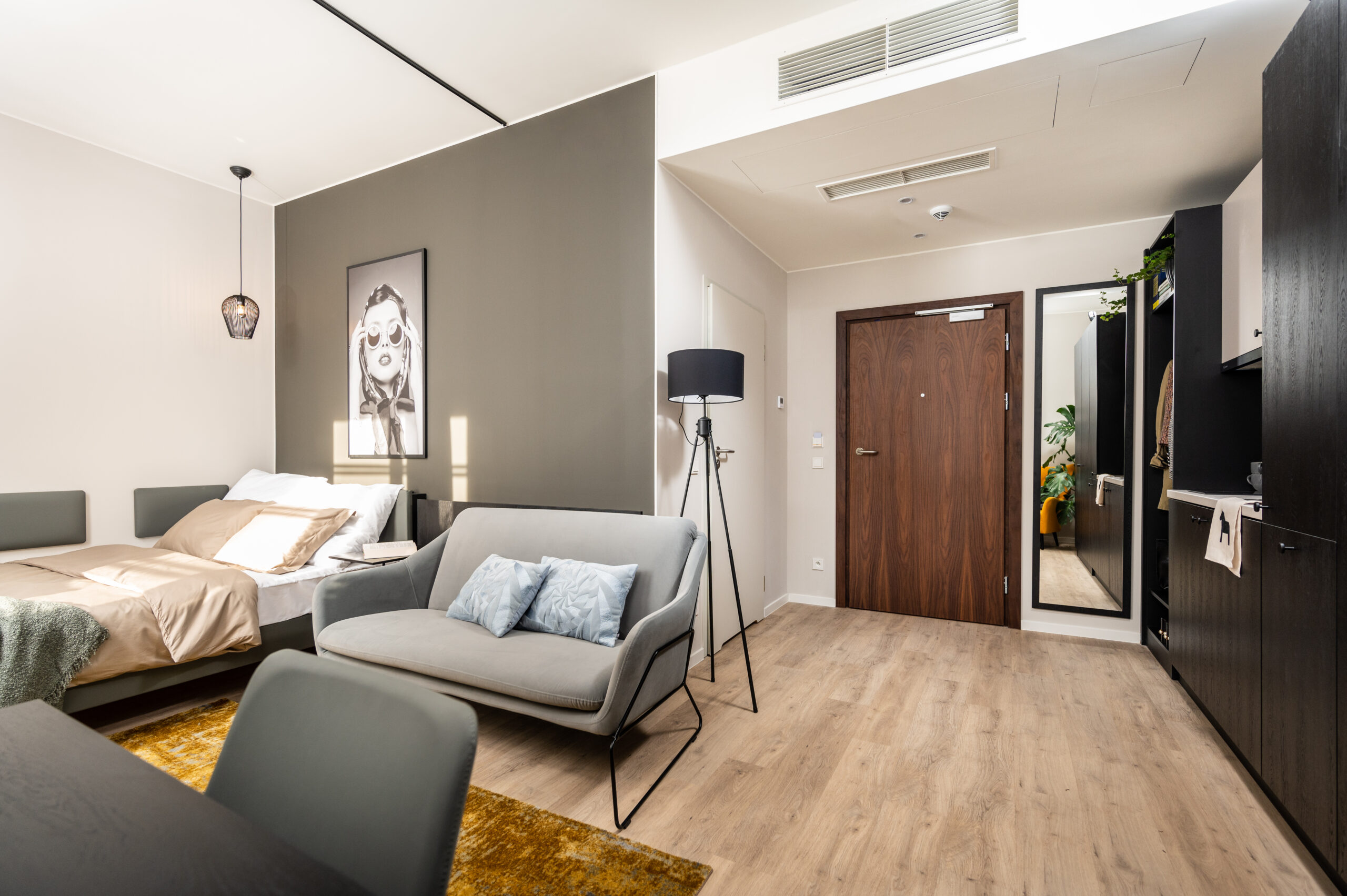The Big Plush Pad is designed for those who like their space generous and their living elevated. Fully furnished and ready to settle into, the studio features a comfortable 140 cm bed, generous built-in storage, and a sleek mini kitchen equipped with a stove, small fridge, and dishwasher for effortless everyday living.