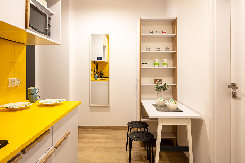Studio to przemyślane, w pełni wyposażone mieszkanie, w którym zadbaliśmy o wszystko. W pełni umeblowane i gotowe do zamieszkania, posiada aneks kuchenny z płytą indukcyjną i lodówką, aby zapewnić Ci energię od porannej kawy po nocne przekąski, a także własną łazienkę.