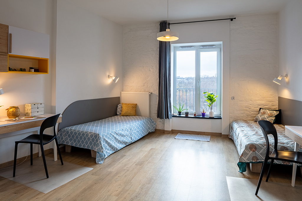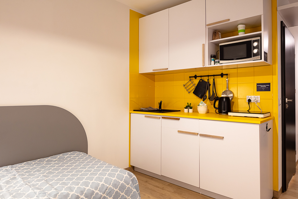 You and another resident share a fully furnished studio between 24-30 m². You’ll have two single beds, wardrobes and study areas in one shared room, plus a private bathroom for just the two of you. The separate kitchen area comes equipped with a hob and fridge — perfect for cooking, eating and hanging out together.